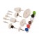 Inclui: 3 discos de polimento com costura espiral: 50, 80 e 100 mm; 2 discos de polimento de algodão solto: 50 e 75 mm; 1 disco de polimento cónico; 1 disco de polimento cilíndrico.5 pontas de lã montadas: bola, cone, ponta cônica redonda, ponta redonda e bala.