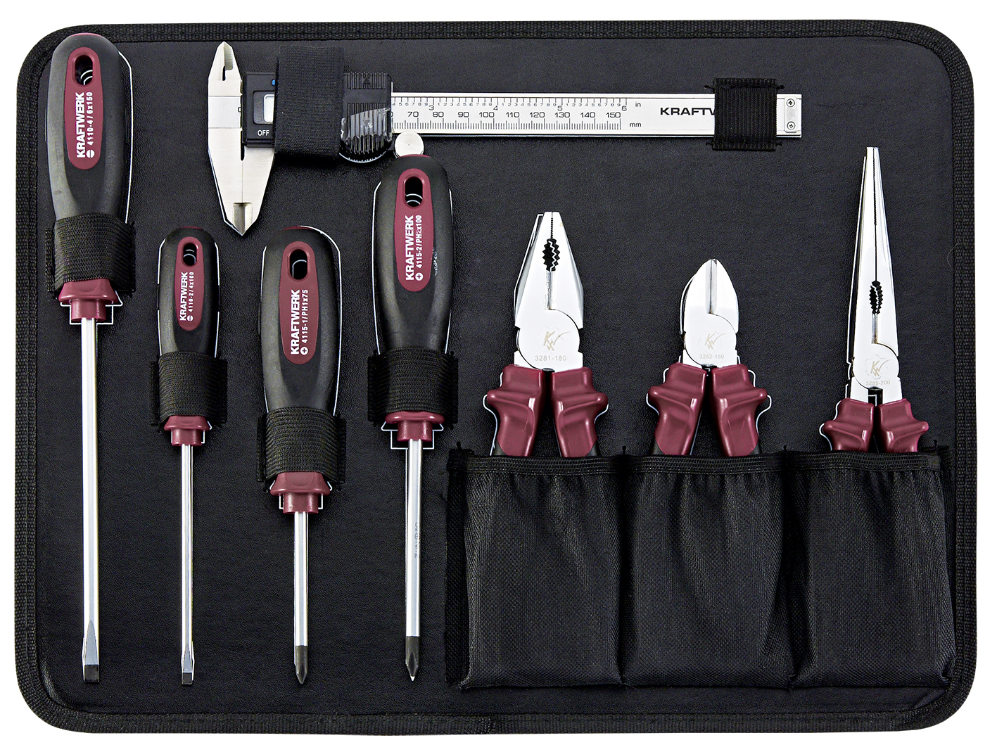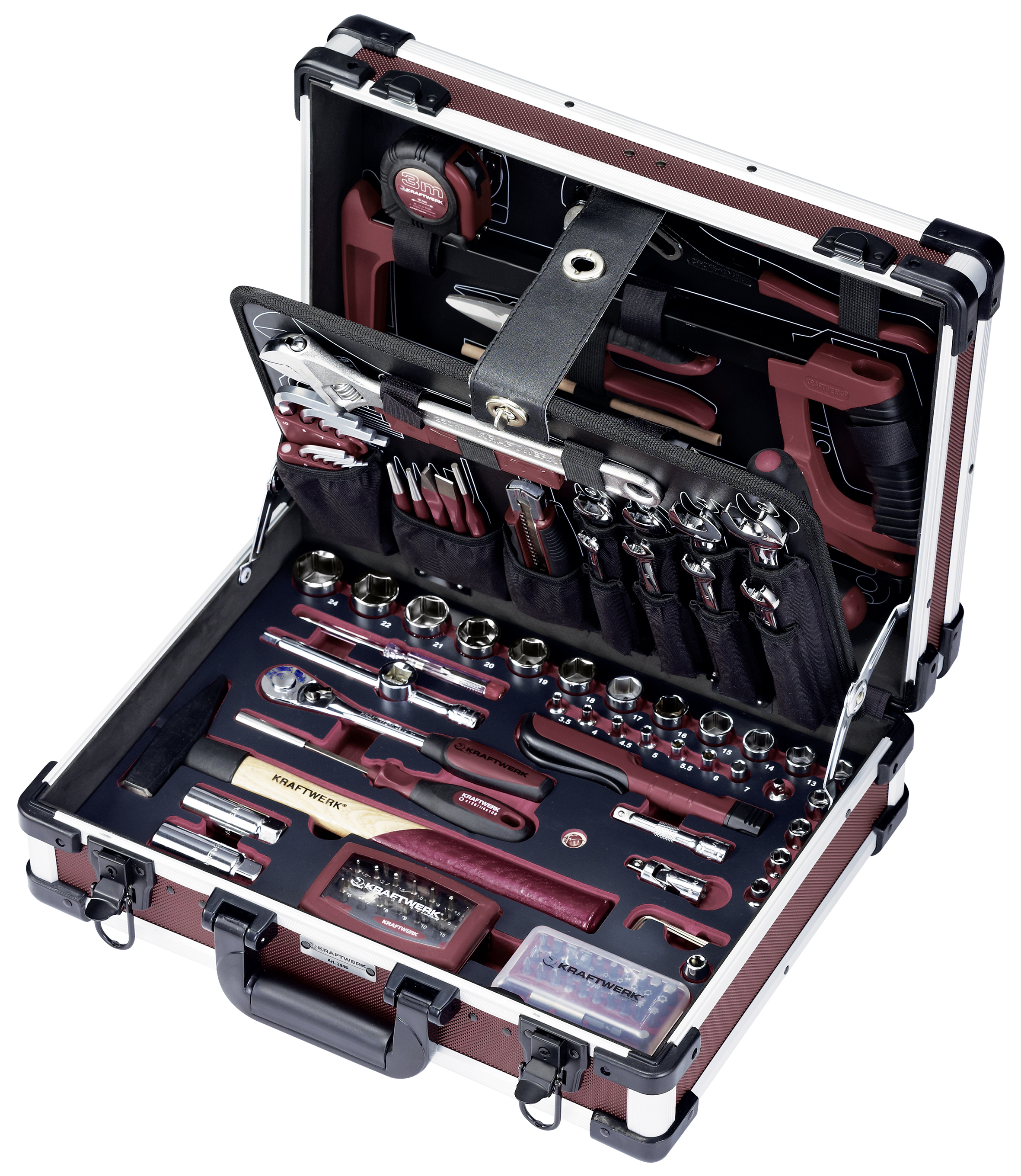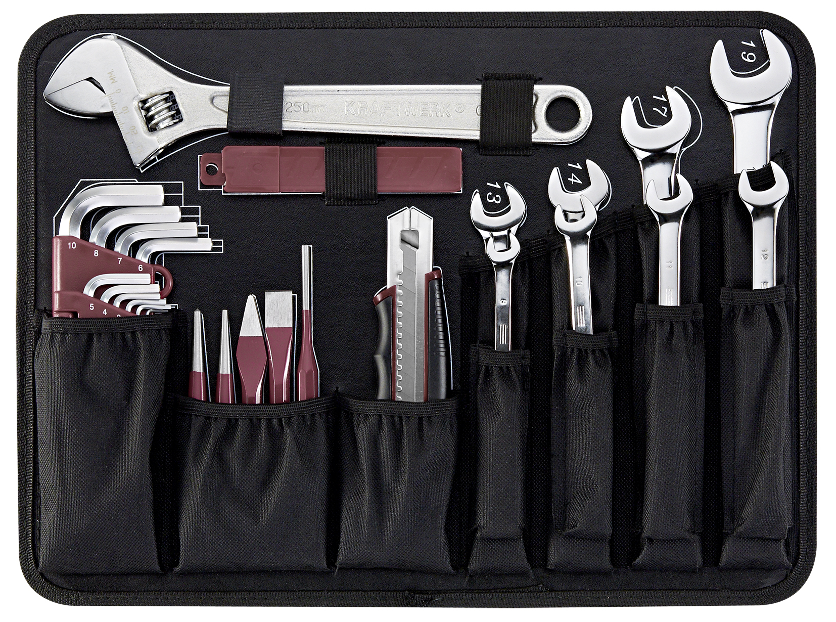 - Ferramentas incorporadas em espuma macia de alta densidade (EVA) com aparência de carbono- Chaves combinadas de 8 - 19 mm